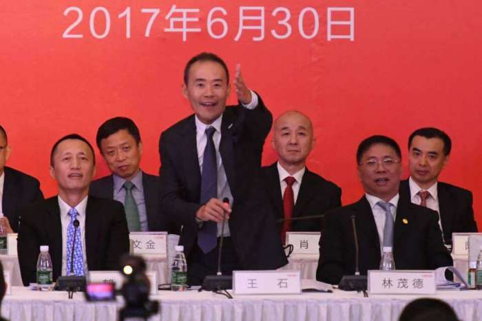 下午两点半,身穿黑色西装系着深蓝色领带的王石步入会场。他面带微笑,步伐轻快,身后跟着郁亮、张旭、王文金等万科管理层,以及新晋第一大股东深圳地铁集团董事长林茂德等人。