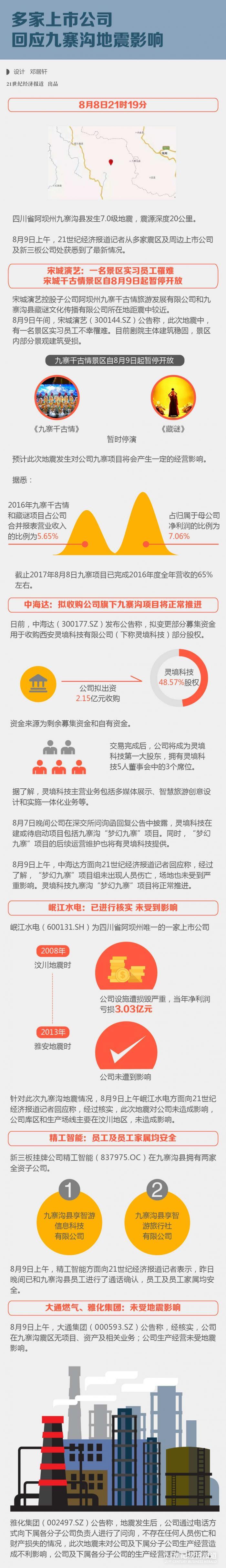 针对此次九寨沟地震情况,8月9日上午岷江水电方面向21世纪经济报道记者回应称,经过核实,此次地震对公司未造成影响,公司库区和生产场线主要在汶川地区,未造成影响。