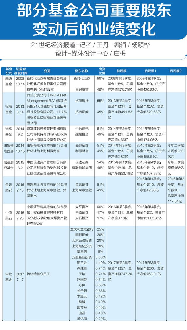 根据证监会披露的信息,7月20日,太平基金新增注册资本金申请刚刚获得核准,7月21日,华宝兴业基金就拿到了股东变更的批文。而此前的7月17日,中欧基金股权变更申请也获得了审核通过。也就是说,一周之内,有三家基金公司扎堆确认了股权或股东的变更事项。