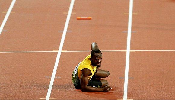 最后一个百米冲刺,博尔特倒在了赛道上。(图片来源:视觉中国)