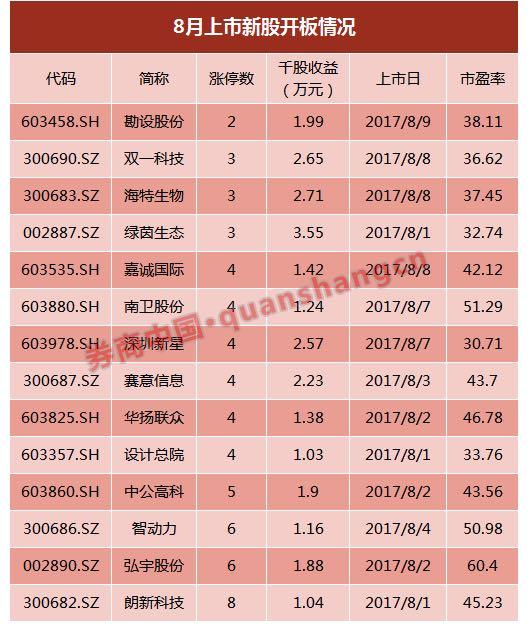 数据显示,8月份新股收益再创新低,14只开板新股平均只有4.29个涨停,其中勘设股份只收获两个涨停即开板,堪称年内“最假新股”之一,而获得涨停板最多的是朗新科技,只有8个涨停。