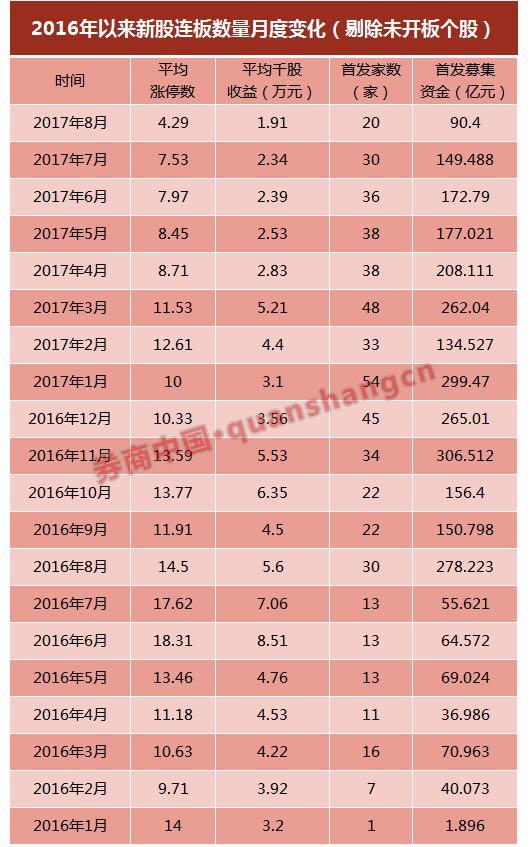 据券商中国记者统计,8月份上市新股中已有14只开板,平均涨停板数量仅为4.29个,平均每千股收益只为1.91万元,为2016年以来的最低纪录,其中最低连板个股只获得2个涨停、最高也只有8个。