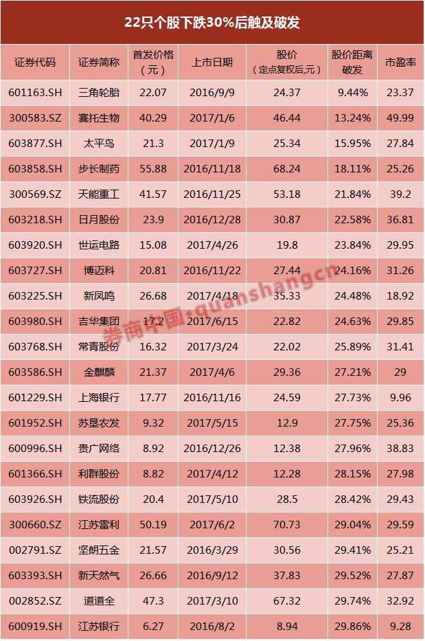 一度还很遥远的新股破发也开始向市场走来。数据显示,在2016年后上市的个股中,已经有22只个股距离发行价只有不足30%距离,三角轮胎、赛托生物、太平鸟和步长制药等4只个股距离发行价不足20%距离,值得关注的是,三角轮胎股价如再下跌9.44%便会触及“破发”。