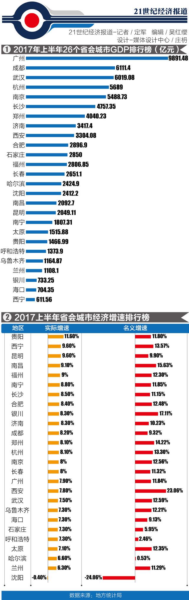随着各地上半年经济数据发布,21世纪经济研究院汇总各地数据,分析各省会城市不同的发展态势。由于拉萨的数据尚未公开,4个直辖市不纳入对比,所以实际排名只包括26个省会城市。