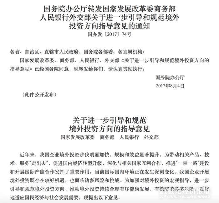 8月18日,中国政府网发布了《关于进一步引导和规范境外投资方向的指导意见》,文件指出,将限制房地产、酒店、影城、娱乐业、体育俱乐部等境外投资,重点推进有利于“一带一路”建设和周边基础设施互联互通的基础设施境外投资。