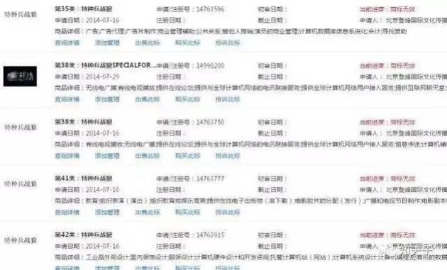 北京登峰国际文化传播有限公司在2014年5月份曾申请注册“特种兵战狼”这个商标。申请的类别有:35类、38类、41类、42类等。但是该商标并未注册成功。