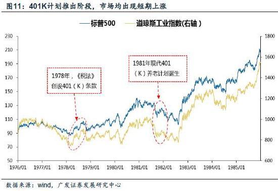 推出阶段:在401K计划的推出阶段(1970年代末-1980年代初),主要有两个关键时间点:1978年税法创设401K条款、1981年美国国税局通过401K计划。可以看到,1978年全年标普500和道琼斯工业指数均明显上升;1981年11月开始标普500和道琼斯工业指数都出现了一波明显的反弹。
