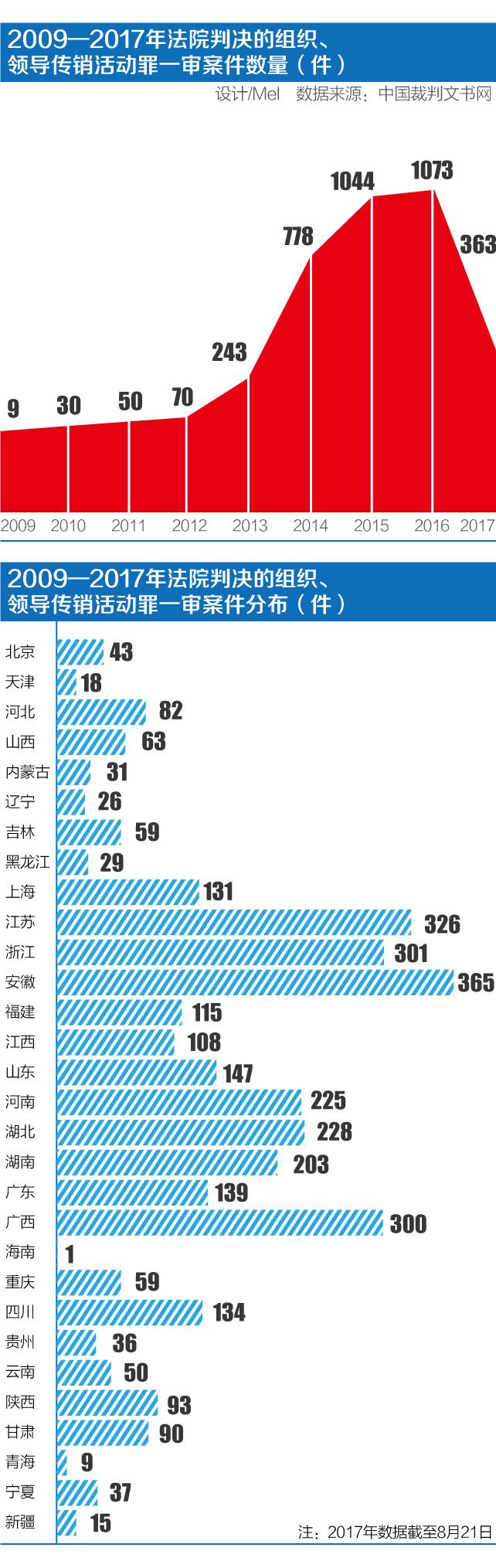中国裁判文书网数据显示,组织、领导传销活动罪一审案件在2014年至2016年数量陡增,分别达到778、1044、1073件。