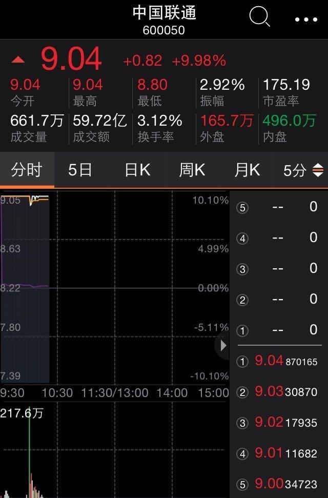 经过一波激烈的多空争夺后中国联通又重回涨停板,截至10:19,逾80万手封板。