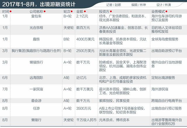 2017年前8个月,趣旅、皇包车、我行集团、一家民宿、任游、懒猪行等10余家服务出境游场景的初创企业相继宣布完成新一轮融资。