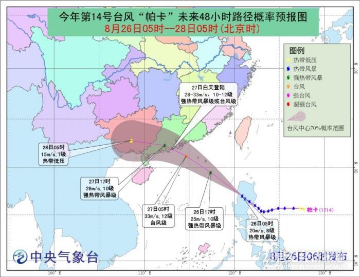 据中央气象台消息:今年第14号台风“帕卡”预计将于明日(27日)在我国广东西部沿海登陆,最大可能登陆地点在广东深圳到茂名一带,登陆强度预计为强热带风暴或台风级(28~35米/秒,10~12级)。气象专家提醒,虽然“帕卡”强度不及前台风“天鸽”,但登陆地点相似,风雨影响区域与“天鸽”高度重合,要谨防灾害叠加效应。记者获悉,8月26日下午1点,广州市区会已经发布台风蓝色预警信号。