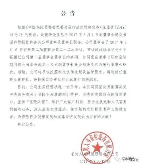 而在今年2月24日,保监会下发行政处罚决定书。经查,前海人寿主要存在编制提供虚假材料、违规运用保险资金等问题,对前海人寿罚款80万元,给予姚振华撤销任职资格并禁止进入保险业10年的处罚。不久后,姚振华辞去前海人寿、前海财险董事长的职务。