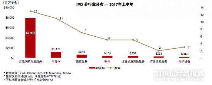 2017年上半年,行业融资额分布略有变动,互联网软件及服务行业处于领先地位,共有13起IPO,融资 总额约79亿美金,占据了全球科技企业IPO融资总额的半数以上。排名第二的为半导体行业,共有11起IPO,融资总额约为12亿美金。通信设备行业排 名第三,共有7起IPO,融资总额约为6亿美金 。