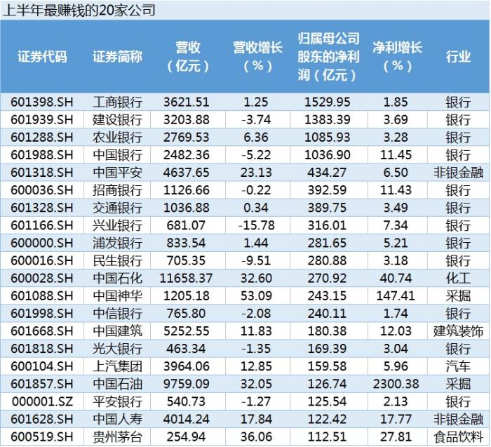 而在净利润前20的上市公司中,12家为上市银行,其中,工商银行依然保持榜首位置,上半年实现净利润1529.95亿元,日均赚逾8.36亿。