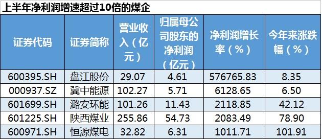 而受益于上半年煤价始终处于高位,煤企可谓是赚的盆盈钵满。数据显示,28家煤企中,其中,净利润增幅超过100%的有22家,超过10倍的有5家,而盘江股份上半年净利润更是大增5769倍,仅有安源煤业一家煤企亏损,亏损额相对去年同期也有所减少。