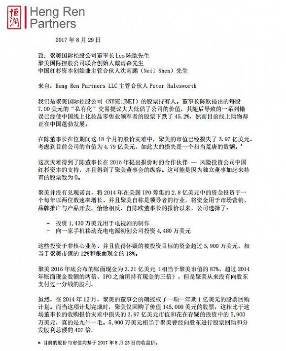 8月29日,聚美优品股东HengRenPartners发表一封致聚美优品董事长和红杉资本中国基金管理和执行合伙人沈南鹏的公开信,炮轰聚美不兑现诺言。