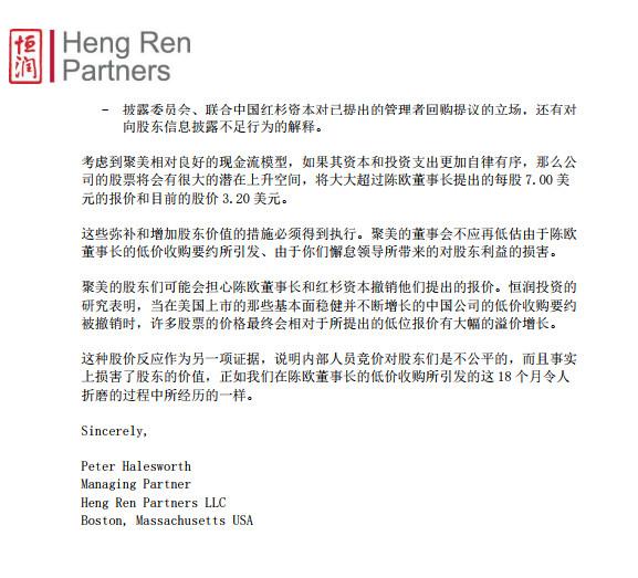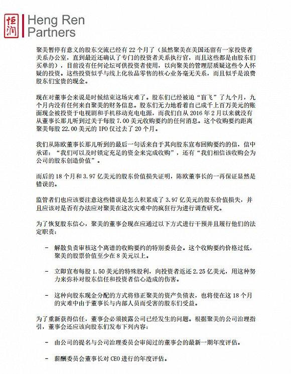 该公开信呼吁,现在对董事会来说是时候结束这场灾难了。“股东们已经被迫盲飞了九个月,九个月内没有任何来自聚美的财务信息。股东们无力地看着自己成千上百万美元的账面现金被投资于电视剧和手机移动充电电源,而我们自从2016年2月以来就没有从董事长那儿听到过关于每股7.00美元收购要约的任何消息。这个收购要约距离聚美每股22.00美元的IPO仅过去了20个月。”