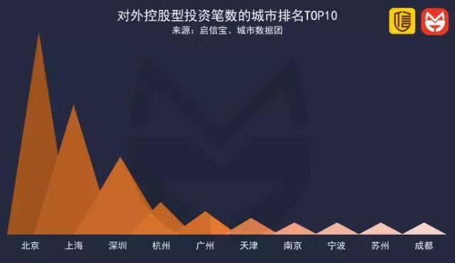 近五年对外控股型投资笔数最多的10个城市如下图所示: