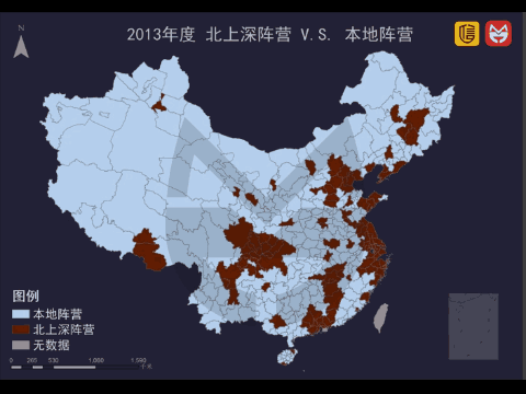 我们把这一趋势变化逐年落在地图上,用红色标识北上深阵营,用蓝色标识本地化阵营。可以看到下面这张动图: