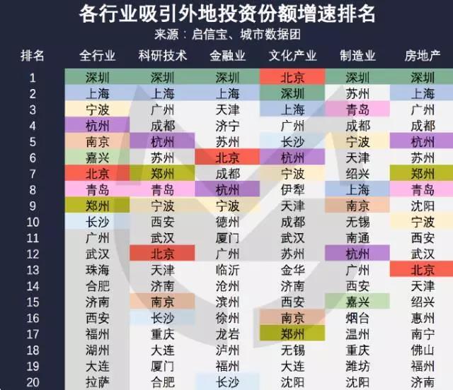 同样的,我们以吸引外地投资占全国比重的增速进行城市排名,得到了另一个榜单: