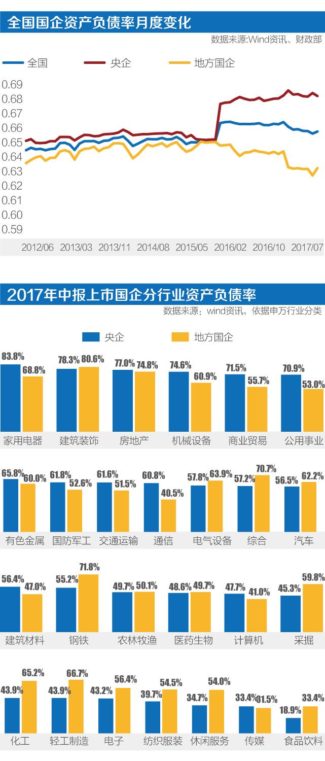国企去杠杆并不容易,财政部数据显示,2016年一整年全部国企资产负债率从年初的66.3%,略微下降到2016年底的66.1%。进入2017年,这个进程略有加快,到7月底全国国企资产负债率为65.7%,相较2016年底下降了0.4个百分点。