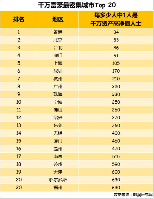报告显示,香港是富豪最密集城市,每34人中就有1人是千万富豪,其次是北京,每83人中有1人是千万富豪。前五大富豪最密集城市中还有台北、澳门和上海。深圳、杭州、广州、珠海和宁波均在前十之列。