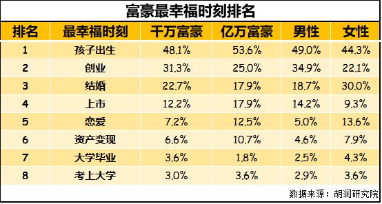 说到最幸福时刻,令人意外的是,无论男女,都将孩子出生视为最幸福时刻,而且亿万富豪人群认为孩子出生为最幸福时刻的比例最高。其次,男性认为创业是第二幸福的时刻,而女性认为结婚是第二幸福的时刻。