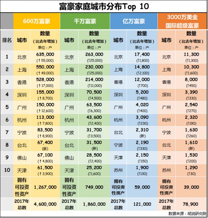 从省市来看,北京拥有最多600万富豪家庭、亿万富豪家庭和3000万美金国际超级富豪家庭,而广东拥有最多千万富豪家庭。上海是600万富豪庭和千万富豪家庭增速最快的,分别比去年增长9.8%和12.2%。