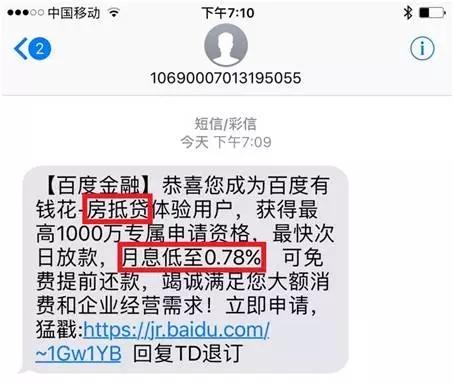 就在文件发布不久,中国基金报记者就收到了百度金融发来的“最高1000万,最快次日放款”的“房抵贷”广告短信。