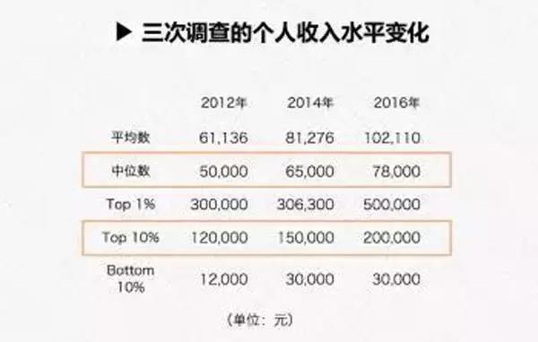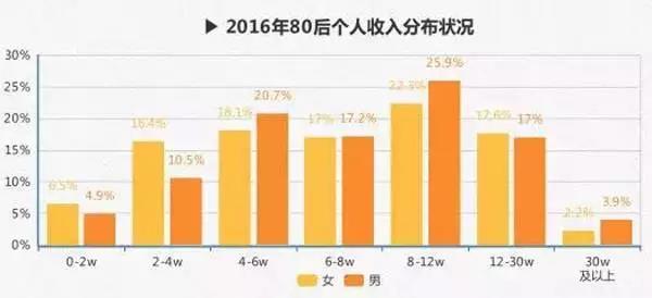 80后中高收入群体的收入增长则更快:2012年进入前10%和前1%的收入门槛为12万元和30万元,2016年已分别提高至20万元和50万元。