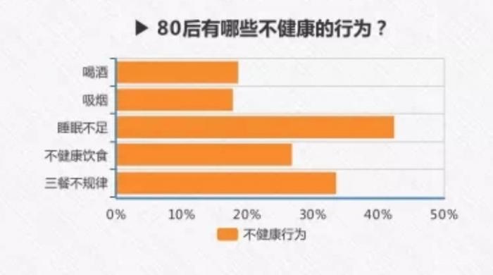 约三分之一的人出现了不健康的行为,分别是睡眠不足、三餐不规律、不健康饮食、喝酒和吸烟,其中睡眠不足最突出、占4成以上,同时具备四种以上不健康行为的高危群体达到14.3%。