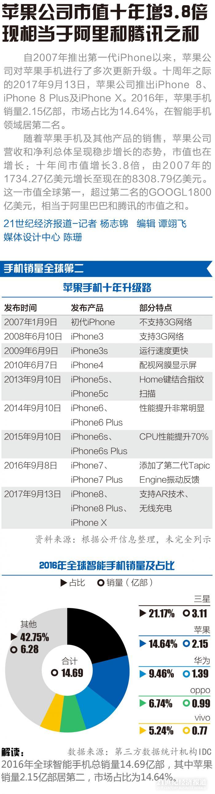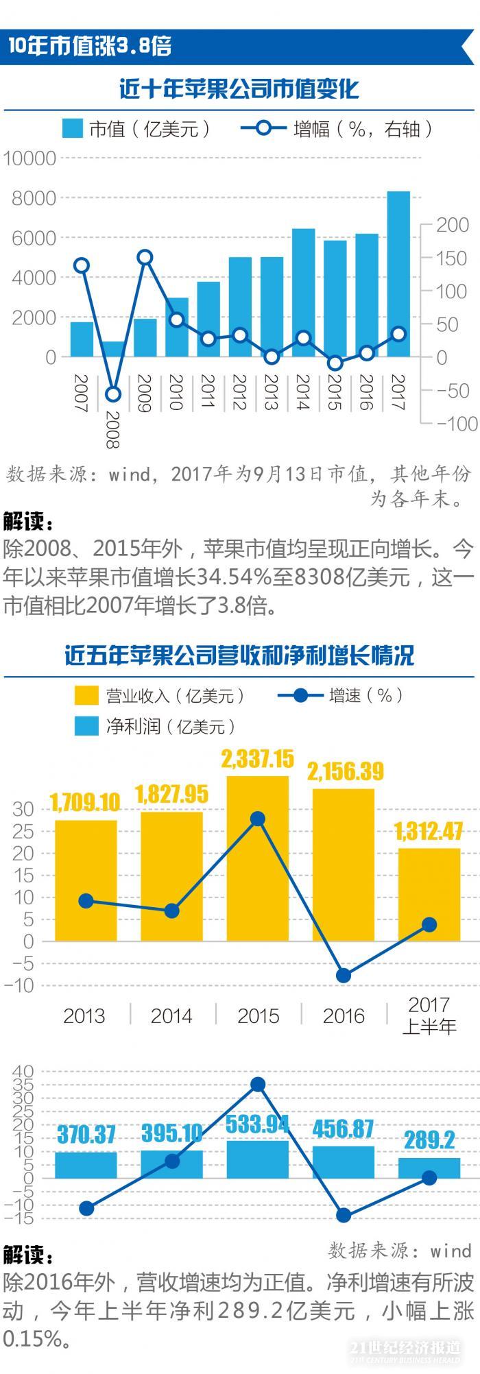 图说丨苹果公司市值十年增3.8倍 现相当于阿里和腾讯之和