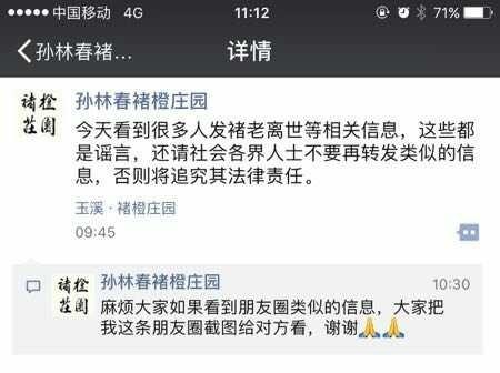 褚橙庄园孙林春在朋友圈表示,褚老离世等相关消息是谣言,请大家不要再转发类似的信息。