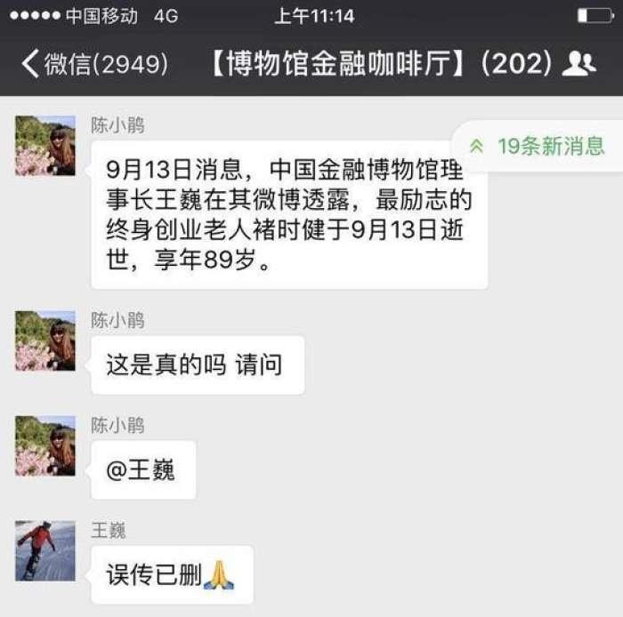 中国金融博物馆理事长王巍在其微博透露,最励志的终身创业老人褚时健于9月13日逝世,但他随后删除了该条微博,并在微信群表示系误传,在微博道歉。