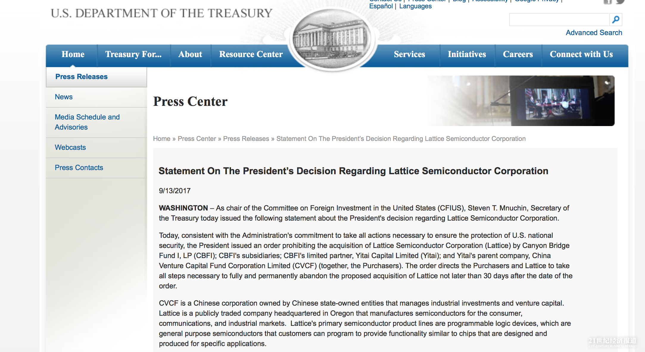 北京时间9月14日凌晨,美国财政部发布声明称,美国总统特朗普下达行政指令,叫停了中国背景私募股权基金(Canyon Bridge Fund Partners)收购美国芯片制造商Lattice的交易,特朗普下达指令要求买卖双方在未来30天内,完成所有必要的步骤,以完全、永久性地放弃收购提案。声明称,美国外资投资委员会(CFIUS)和总统评估认为该交易对国家安全带来风险,买卖双方提出的缓和方案并不能解除这些风险,风险包括知识产权转移给外国买家,中国政府在这项交易中的支持立场,完整的芯片供应链对于美国政府的重要性,以及美国政府对于Lattice产品的使用。