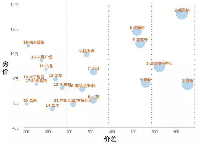 我们将各个板块分开来计算了板块内最贵和最便宜火锅的价差,发现部分板块的价格差距上简直“云泥之别”,在全市一百多个板块中,火锅的平均价差是133元/人,为便于图形呈现,我们选取了差价排名TOP20的板块,增加板块的房价维度进行了对比。可见拥有“最贵火锅”的虹桥板块当仁不让的排在第一位,板块内火锅消费均价价差达到了953元/人(老实说近一千元的人均消费在哪个板块都会与其他火锅店形成巨大价格差),火锅的价差越大,说明板块内活动人群的收入差异较大,活动人群更为复杂,可以看到上文所述的人民广场、静安寺均火锅价差均跻身全市TOP20。