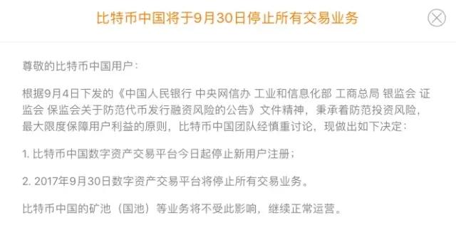 上海监管也已行动,9月14日晚间,位于上海的国内三大虚拟货币交易所之一的比特币中国率先发布公告称将于9月30日暂停所有交易,但矿池等业务不受影响。