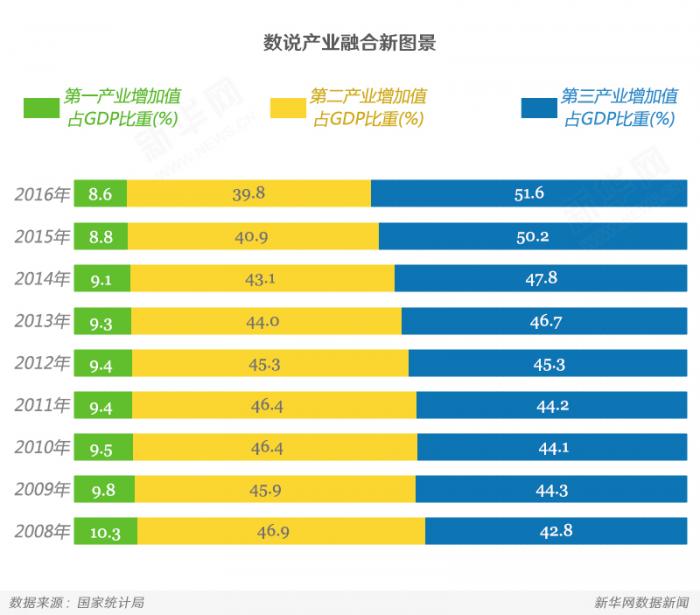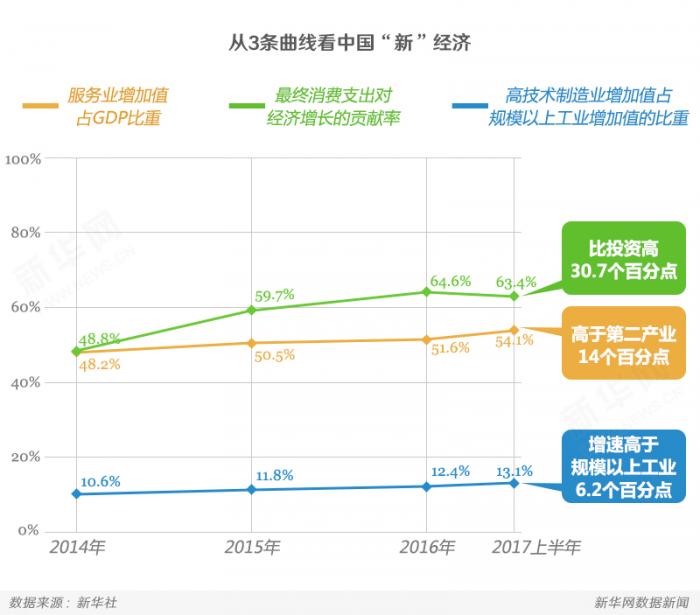 2014年到2016年,服务业增加值占GDP比重为48.2%、50.5%、51.6%,今年上半年为54.1%,高于第二产业14个百分点;