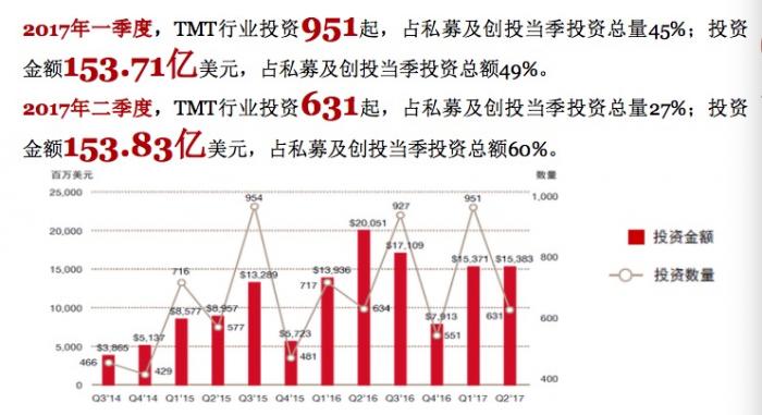 9月26日 ,普华永道发布的MoneyTreeTM报告显示,中国TMT行业在经历了去年下半年的“资本寒潮”之后开始回暖,私募及创投恢复活跃。2017年上半年,私募及创投(PE/VC) 在科技、媒体及通信(TMT)行业的投资数量再创半年度新纪录,投资量达到1582笔,环比增加104笔;投资总额达到307.5亿美元,环比增长22.9%。