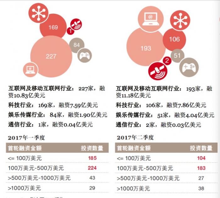 报告还显示,2017年上半年,TMT行业首轮投资数量占比维持在50%以上。首轮投资的金额占比小幅上涨15%,但从2014年以来的历史数据看,2017年首轮投资在数量和金额上仍处于历史较低水平,一定程度上说明投资者仍然保持谨慎观望的态度。