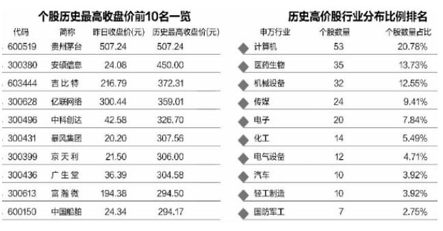 事实上,A股历来不缺少高价股。安硕信息、全通教育、长春高新、腾信股份等股价曾一度超过贵州茅台,登顶A股第一高价股。统计显示,A股中,历史最高收盘价格在100元以上的共计255只。从行业分布来看,高价股更加扎堆计算机行业。近些年来,计算机行业股票的市场关注度一直居高不下,这与计算机行业的发展前景及高科技含量不无关系;医药生物、机械设备、传媒等行业高价股也不少。上述四个行业个股数量合计占比过半。