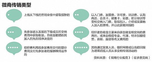 征求意见稿提出,微商活动禁止任何形式的传销。微商传销是指通过对被发展人员以其直接或者间接发展的人员数量,或者销售业绩为依据计算和给付报酬,或者要求被发展人员以交纳一定费用为条件取得加入资格等方式牟取非法利益,扰乱经济秩序,影响社会稳定的行为。