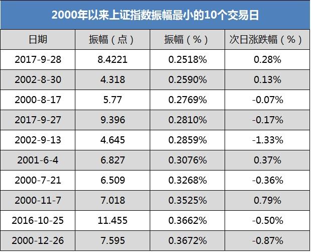 值得注意的是,沪指已连续24个交易日单日振幅不超过1%,而上一次出现类似情况还得追溯到1992年2月。9月28日,沪指以单日0.2518%的振幅刷新历史新低,9月27日也位列2000年以来沪指振幅最小的10个交易日里。