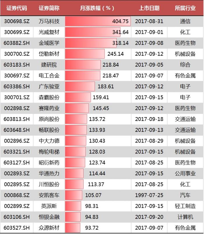 尽管A股持续低振幅,但市场炒新热情依然高涨,除了安凯客车以外,9月涨幅位列前20的大牛股全被8、9月次新股包揽,其中8月31日上市的万马科技暴涨4.04倍问鼎。
