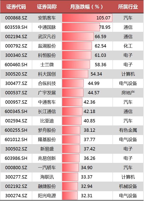 剔除新股后,9月20大牛股主要来自汽车、电子、电气设备、通信等行业,其中新能源汽车概念安凯客车以8个涨停累计105.07%的月涨幅位居榜首。