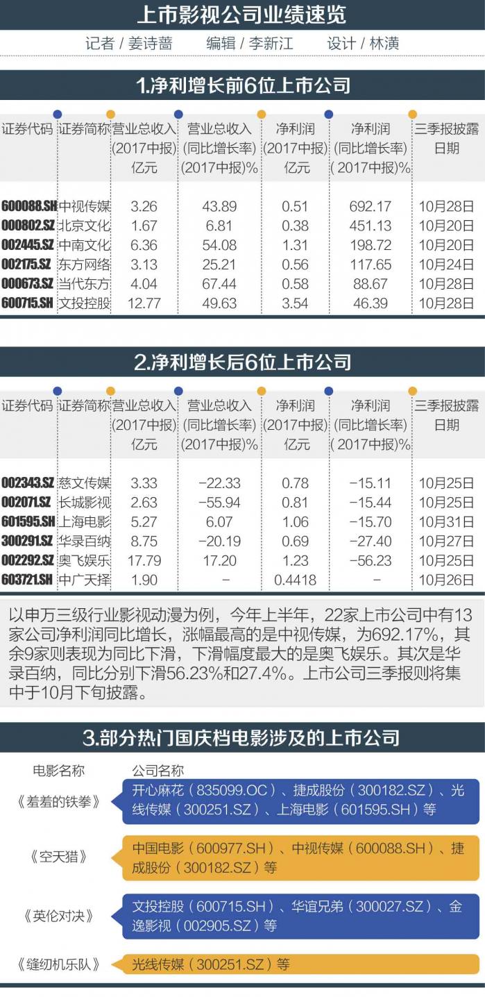 21世纪经济报道记者统计数据显示,国庆档即将上映的电影中,背后是光线传媒(300251.SZ)、华谊兄弟(300027.SZ)、捷成股份(300182.SZ)等多家上市公司以及新三板挂牌企业开心麻花(835099.OC),其中涉及的投资方更是不计其数。