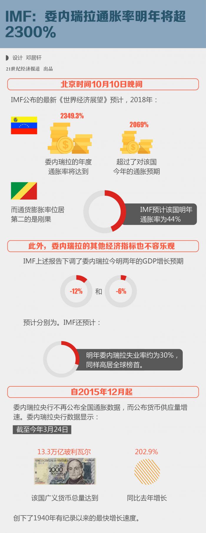 北京时间10月10日晚间,IMF公布的最新《世界经济展望》预计,2018年,委内瑞拉的年度通胀率将达到2349.3%,超过了对该国今年的通胀预期:2069%。而通货膨胀率位居第二的是刚果,IMF预计该国明年通胀率为44%。