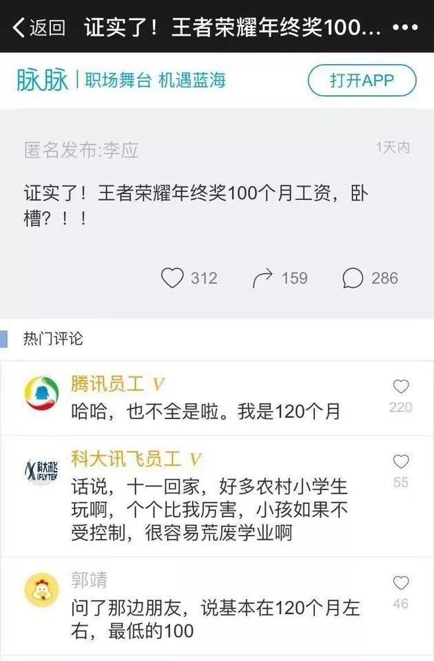 今天午间时分,一张来源某社交软件的截图流传开来,上面有人匿名发布一条消息,内容是“证实了,《王者荣耀》(团队)年终奖100个月工资!”下面紧跟着一名为“腾讯员工”留言回复“哈哈,也不全是啦,我是120个月。”