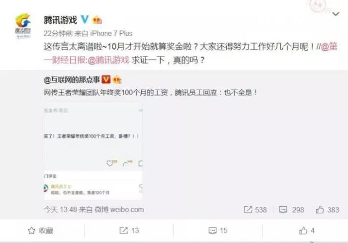 面对这一系列的讨论热议,下午3点左右,在第一财经日报的追问下,腾讯游戏官方回应称“这传言太离谱啦~10月才开始就算奖金啦?大家还得努力工作好几个月呢!”