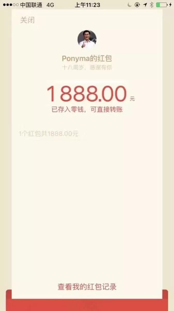 庆典当天腾讯还为在职员工、离职员工、外包人员和公司服务人员准备了总额约3000万元的现金红包,单个红包金额在188-1888元之间不等。